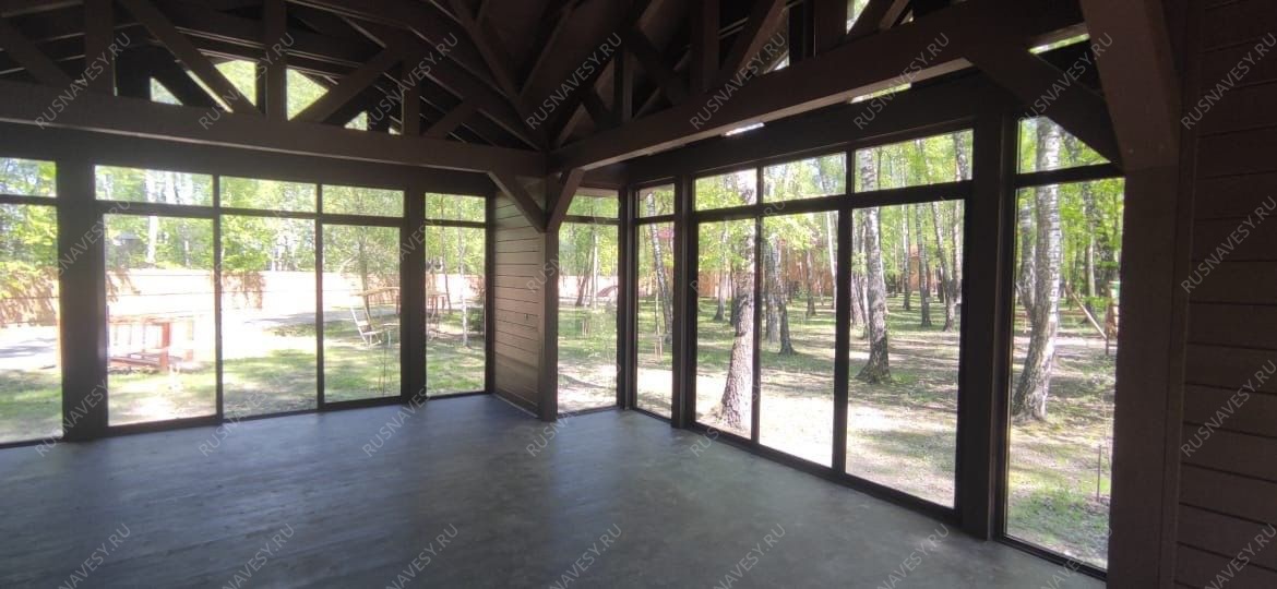 Потолок не подшит, видна стропильная система. Свесы подшиты – имитация бруса 16×135 мм