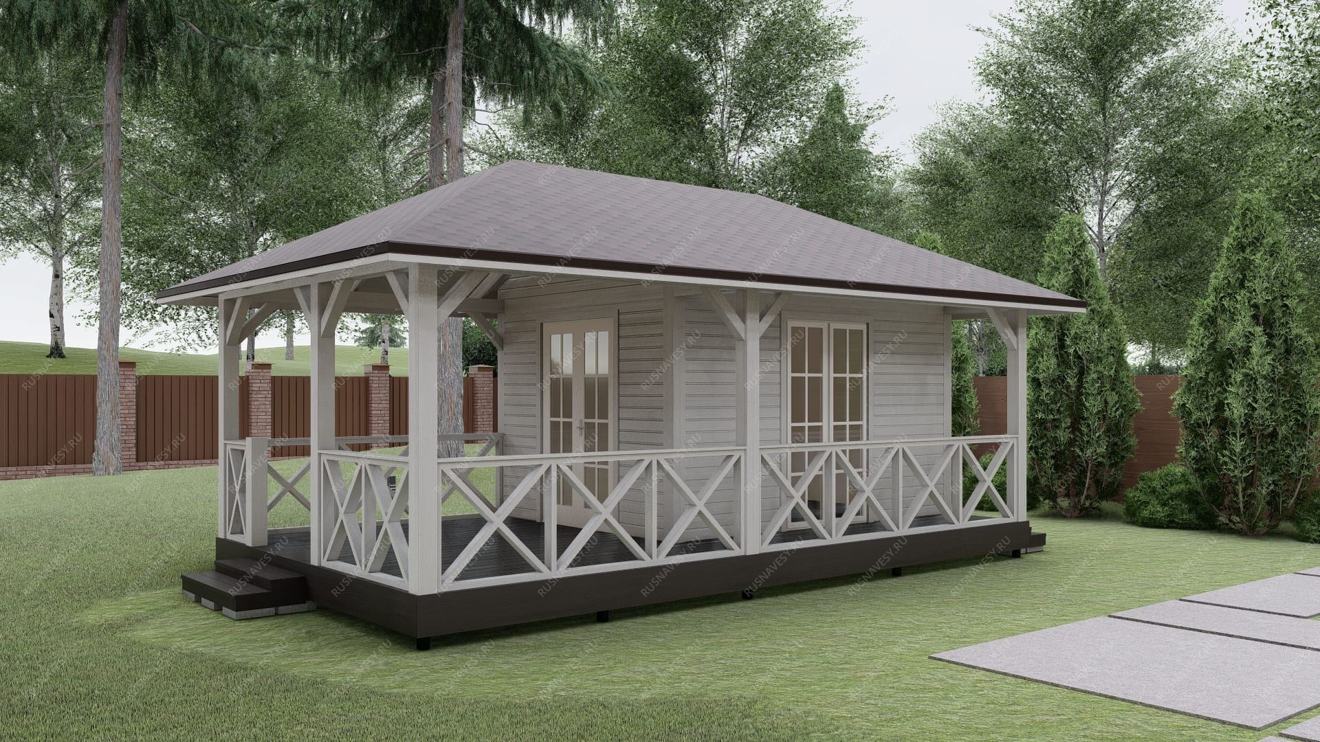 Потолок не подшит, видна стропильная система. Свесы подшиты – имитация бруса 16×135 мм