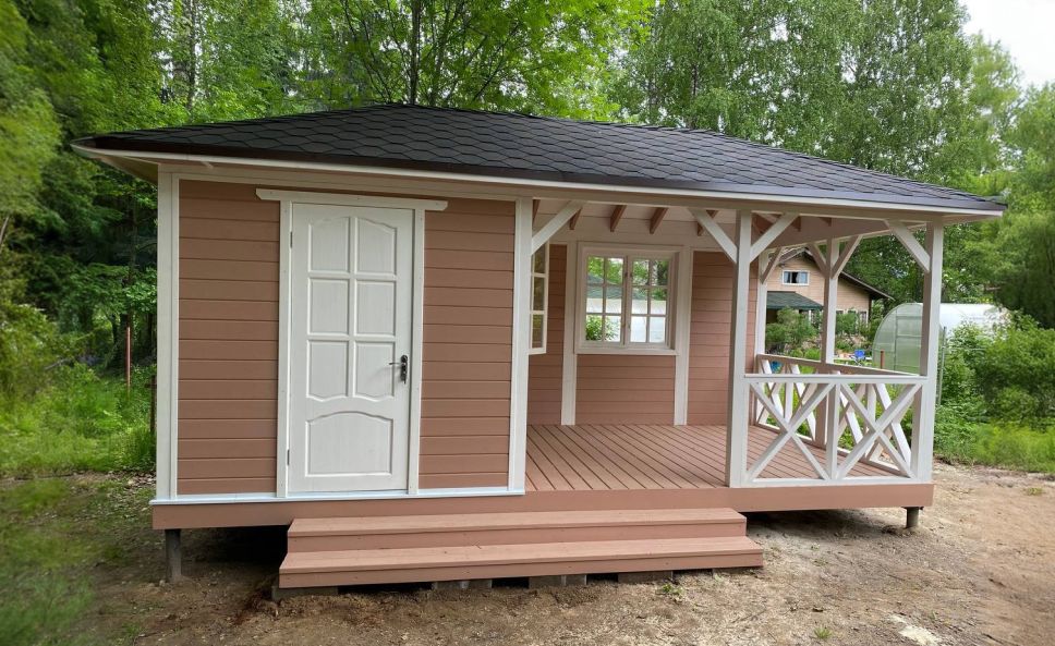 Имитация бруса 16×135 мм внутри, имитация бруса 21×135 мм снаружи.